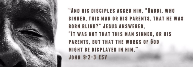 “As he passed by, he saw a man blind from birth. And his disciples asked him, “Rabbi, who sinned, this man or his parents, that he was born blind?” Jesus answered, “It was not that this man sinned, or his parents, but that the works of God might be displayed in him. We must work the works of him who sent me while it is day; night is coming, when no one can work. As long as I am in the world, I am the light of the world.” Having said these things, he spit on the ground and made mud with the saliva. Then he anointed the man’s eyes with the mud and said to him, “Go, wash in the pool of Siloam” (which means Sent). So he went and washed and came back seeing.” (John 9:1-7 ESV)