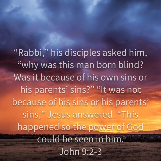 When it comes to suffering, we want someone to blame. Notice the disciples ask what caused the man’s blindness, his or his parents’ sin? Before we tackle this topic, let me state clearly, all suffering and disease is ultimately caused by sin. When sin entered our world so did death, disease, suffering, and struggle. But, I like what John Piper says about these verses: “specific sins in the past don’t always correlate with specific suffering in the present.” So, while we suffer and struggle because we live in a broken world we shouldn’t look for specific sins (or persons) to blame.