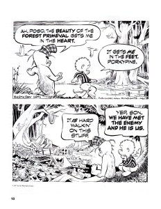 There’s an old comic strip from when I was a kid that pretty much sums it up. The strip was about a possum named Pogo and his friends in Okefenokee Swamp. One very memorable strip shows Pogo and his friend Porkypine “walking” through the swamp. Porkypine comments, “Ah, Pogo, the beauty of the forest primeval gets me in the heart.” Pogo replies, “It gets me in the feet, Porkypine” as he steps carefully over something. In the next frame Pogo and Porkypine are looking across the swamp littered with trash and junk. Porkypine laments, “It is hard walking on this stuff.” Then Pogo utters those prophetic words, “Yep son, we have met the enemy and he is us.”